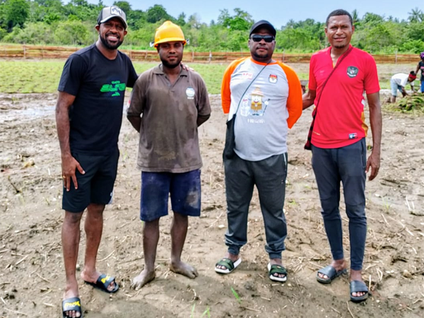 Boas Solossa (T-Shirt Hitam) dan Tinus Pae (Jersey Merah) bersama KPK SKouw Mabo di lapangan Sepakbola Kampung Skouw Mabo yang sedang dikerjakan (Foto : Dok. Pemerintah Kampung SKouw Mabo)SKOUW MABO| TEMAWONEWS.COM - Dua legenda hidup Persipura Jayapura Boas Solossa dan Tinus Pae pada Sabtu (19/10/24) mengunjungi dan melihat secara langsung proses pembuatan/pengerjaan lapangan sepakbola Kampung Skouw Mabo